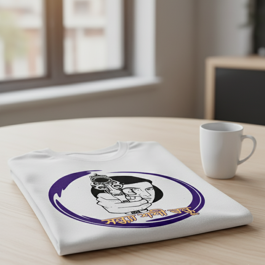Crack the case with this dynamic t-shirt dedicated to the great detective, Feluda! Featuring a dramatic graphic of a hand holding a gun—a nod to the action in his mysteries—and the iconic code: "সন্ধ্যা শশী বন্ধু" (Sondha Shoshi Bondhu). Made from 100% premium cotton for a breathable and comfortable fit. Perfect for the intellectual detective fan in your life!